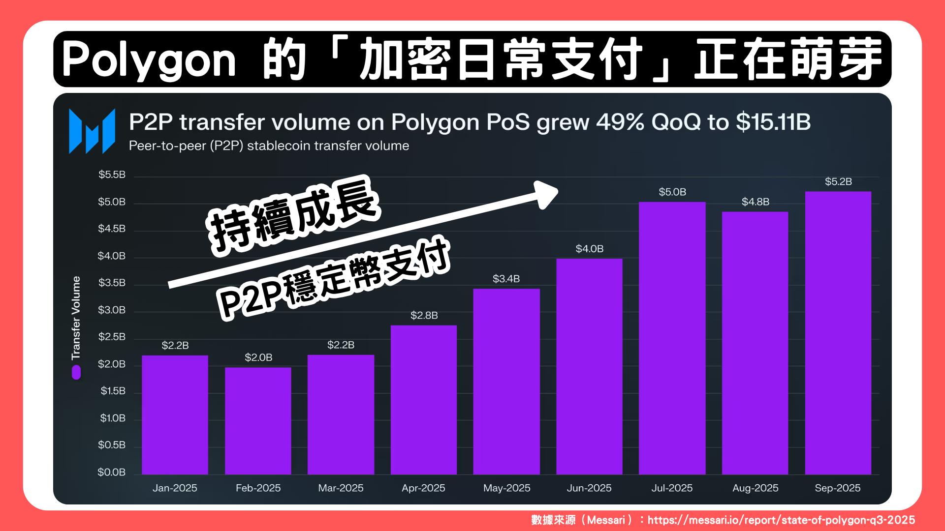 根據 Messari 發布的 Polygon Q3 報告,Polygon 過去一年的整體活躍度與鏈上收入雖表現平平,但在支付應用上進展明顯。與穩定幣掛鉤的 P2P 交易、信用卡支付量皆有成長,支付型 App 的使用量也在提升。