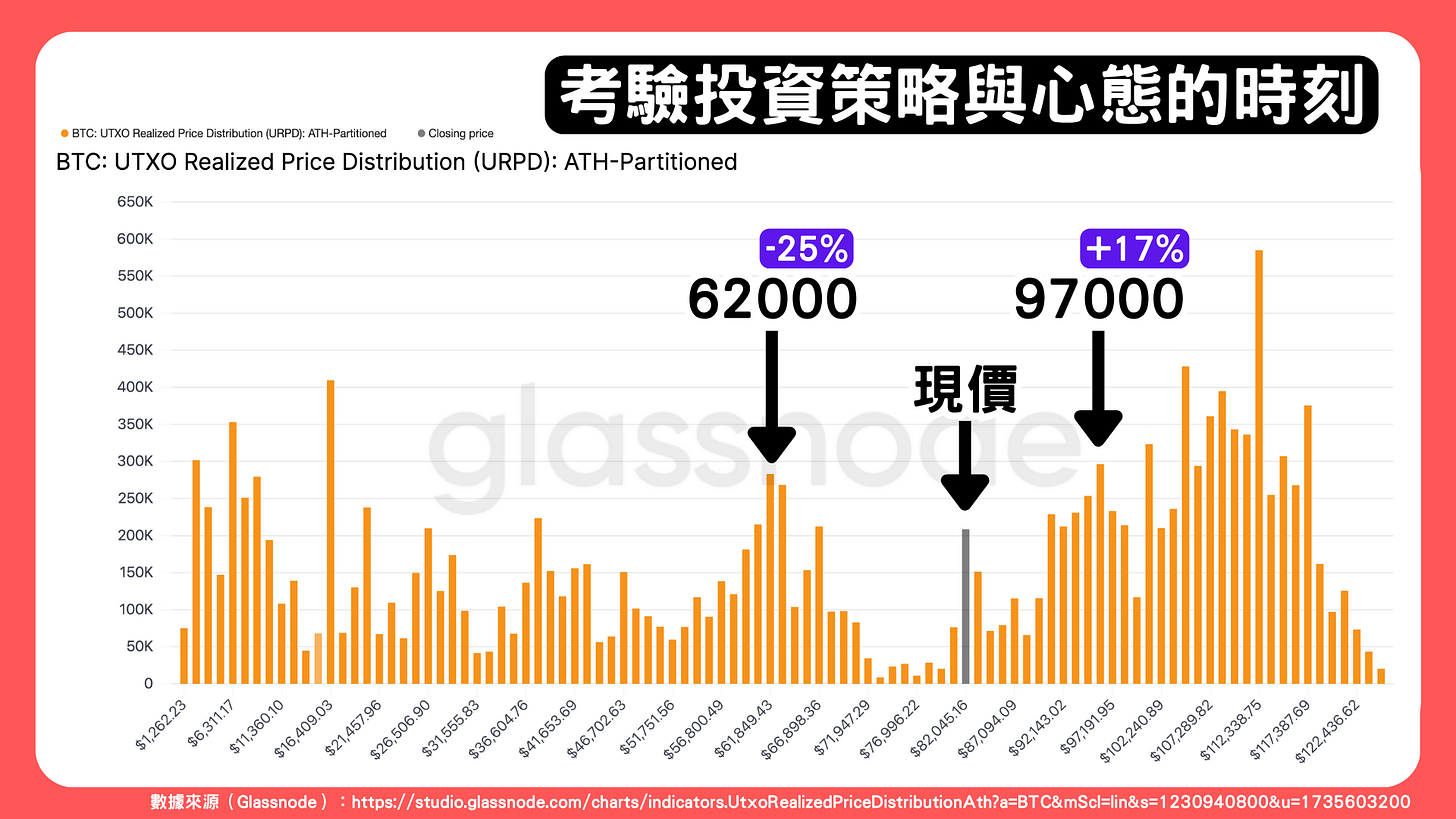 Owen 歐文笑長:比特幣的 UTXO Realized Price Distribution(URPD)顯示了持有者的成本分佈。若觀察當前幣價 84,000 美元,可看出下方缺乏明顯支撐,一直到約 62,000 美元才具備較強買盤,代表仍有 25% 的下跌空間。上方則在 97,000 美元附近有較重賣壓,需要克服約 17% 的漲幅才能突破。
