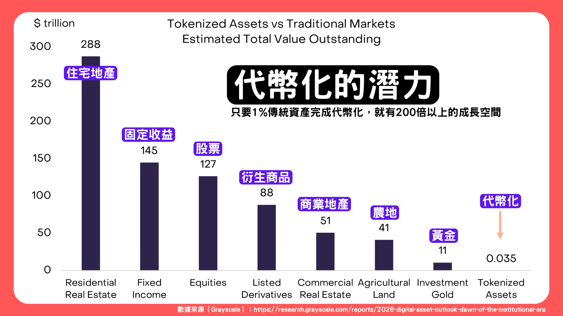 目前全球傳統資產的總市值超過 750 兆美元。其中,住宅房地產約為 288 兆美元,固定收益與股票市場分別約 145 兆與 127 兆美元,投資型黃金則約 11 兆美元。相比之下,現階段的代幣化資產總規模,僅約 0.035 兆美元,與傳統資產存在極大的落差,也代表「價值轉換空間」很驚人。