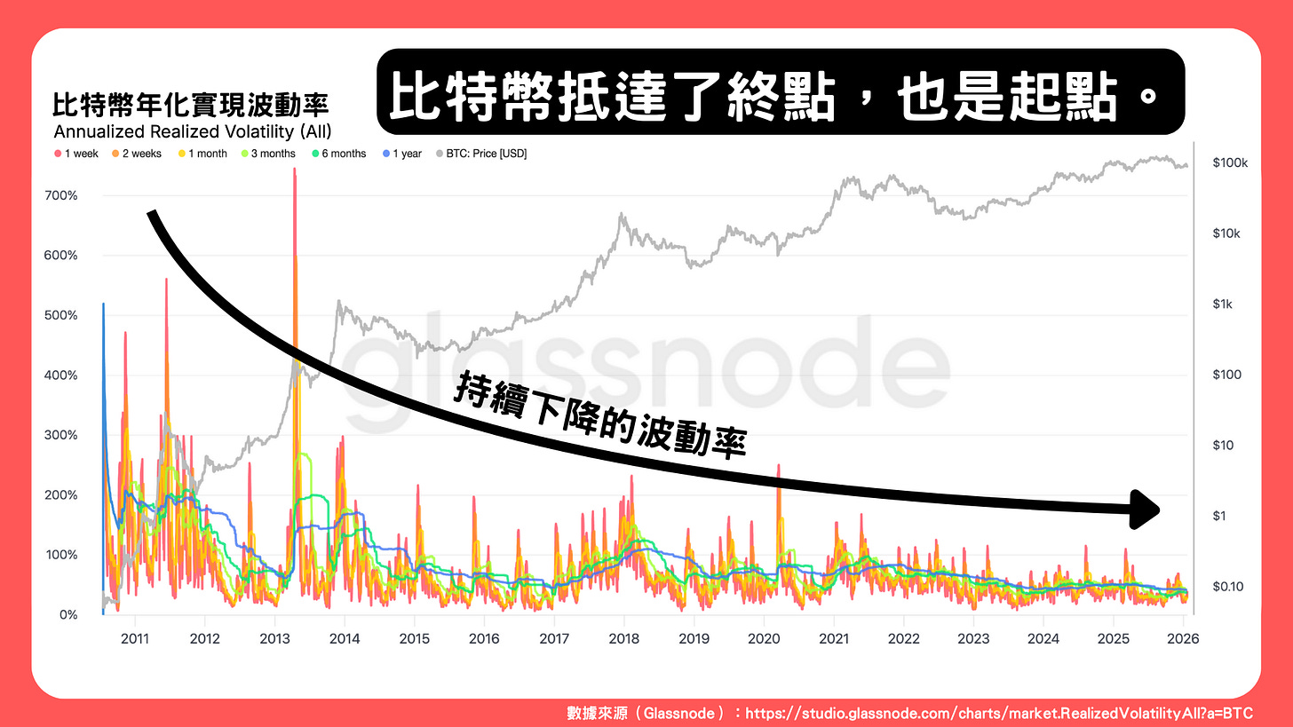 若從「年化實現波動率」來看,可以發現數值持續收斂,代表比特幣正逐漸轉型為穩定的資產,也就是所謂的「低風險資產」。這就十分有趣了,如果比特幣是低風險的,從一年漲十倍,變成十年漲一倍。你還會想持有它嗎?又是什麼樣的人,會在未來持有這種「無趣的」比特幣?