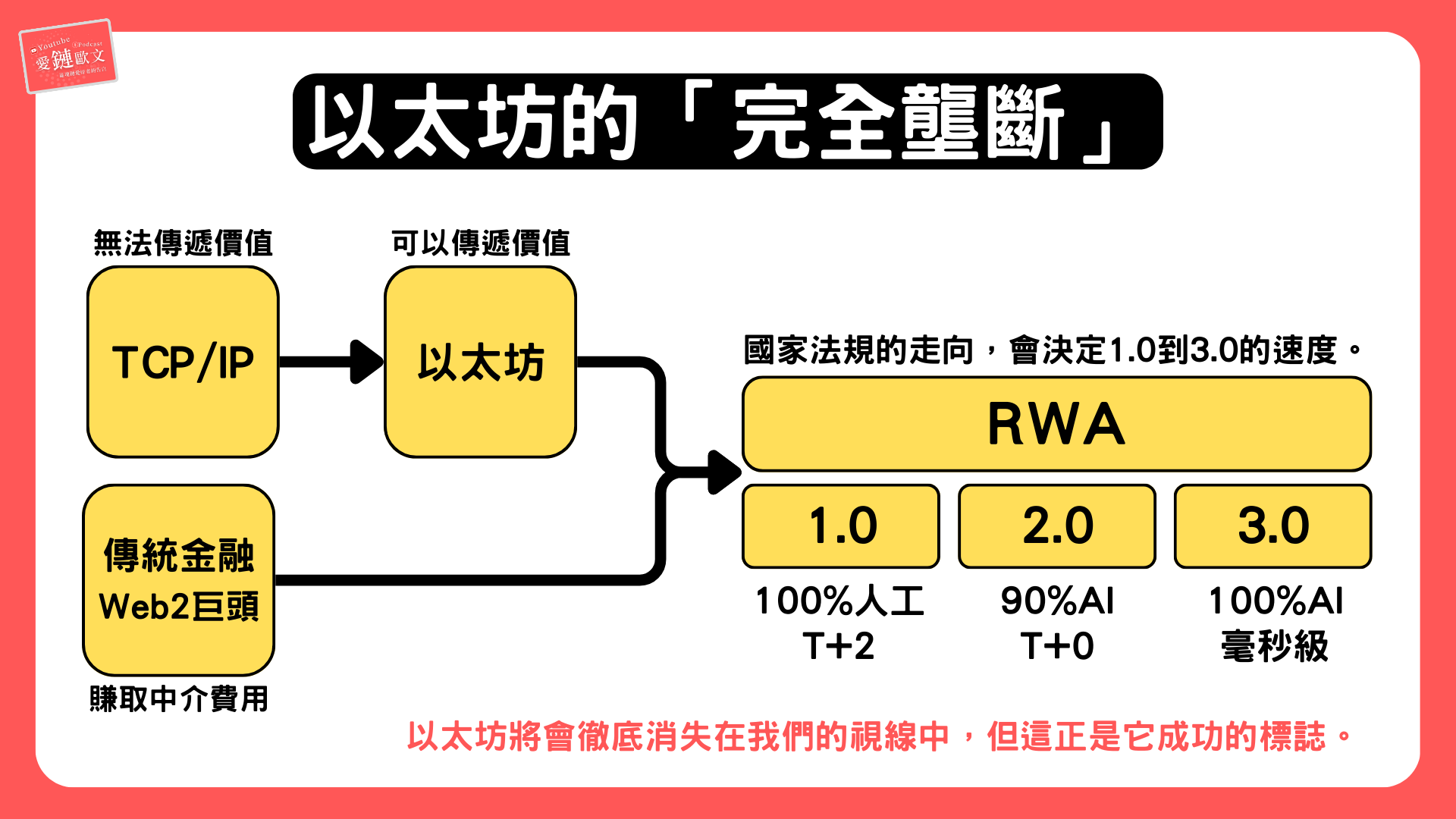 RWA 的強大之處,在於它觸動了人類社會最核心的權力結構:「國家主權、政府法律、金融規則」。當這類場景開始與鏈上技術融合,以太坊極有可能從邊緣科技,躍升為掌握全球命脈的壟斷性基礎建設,最終成為你我生活中不可或缺的必需品。