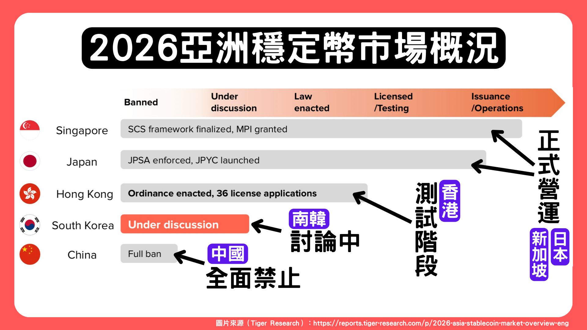Owen 歐文笑長:Tiger Research 近期發布的《2026 亞洲穩定幣市場概況》報告,很細緻的說明亞洲五大市場的穩定幣進展。可以看看各地的立法方式,以及穩定幣發行策略有何不同。