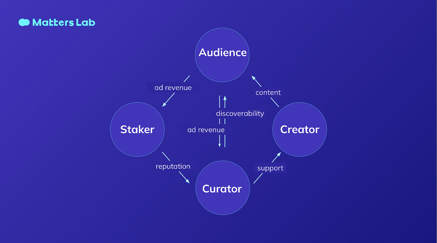 在 10/23「g0v 十週年生日趴🎂」,Matters Lab 的 Emilie 上台短講投影片第 11 頁,就有以 Curator 為重心的生態圖: